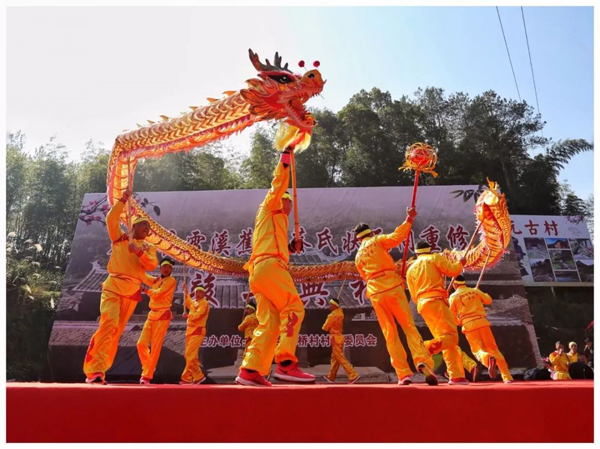 “双龙戏珠”的舞龙表演“引爆”了现场的礼花,为竣工典礼拉开了序幕。双桥村村支部书记蔡家城上台致词,对不远千里、风尘仆仆、回家祭祖的蔡氏族裔代表们表示热烈的欢迎,并希望在家族大团圆的盛会上,大家汇集一堂,共叙情怀,共同缅怀先祖,祭奠始祖安息之茔,弘扬家族优良传统文化。
